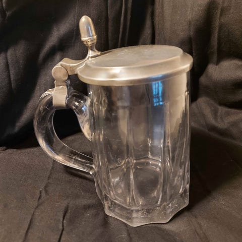 Låget mangler, men det er bare den flotteste dekoration og glød denne lille krukke har. Den er 8 cm høj og i hel og fin stand. Brug den til makeuppensler - blyanter mm. Jeg kan ikke tyde stemplet, men Musters-chutz betyder registret design - copyright - mønsterbeskyttet.