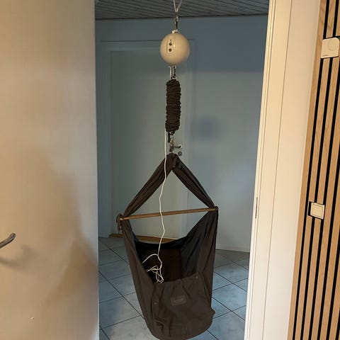 Moonboon slyngevugge inkl. krog til loftet. Vi fik den i gave i 2023, men den har aldrig været brugt.