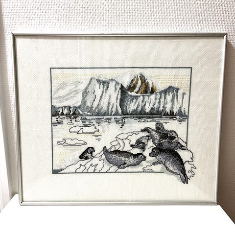 Stort vintage broderi med arktisk motiv i metalramme.