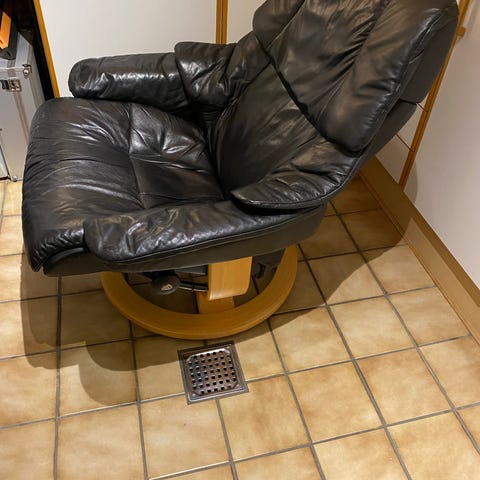 Stressless Reno sort læder hvilestol med justerbar nakkestøtte og matchende fodskammel. Egebejset ramme. Stolen er 10 år gammel med pæn læder stand