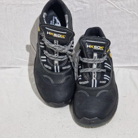 Sikkerhedssko i sort med orange detaljer og snørebånd. Skoene har en robust sål og forstærket tå.