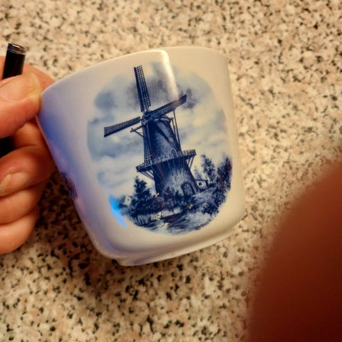 Delfs urtepotteskjuler med klassisk blå og hvide blomsterdekorationer. Fin blank glasur. Fremstillet i porcelæn med riflet mønster nederst. Højde 13 cm. Ingen skår eller revner.