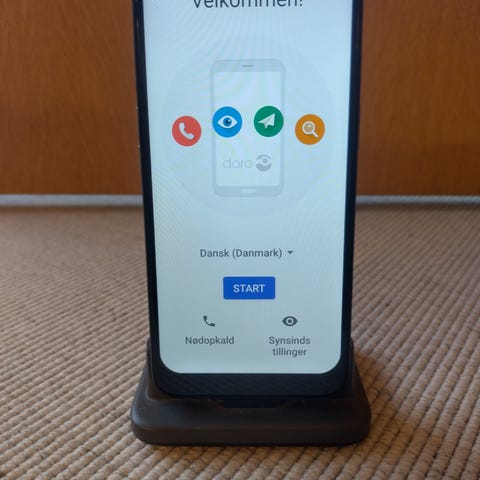 Doro seniortelefon med stor skærm og knapper, designet til nem betjening. Telefonen har tydelige taster og en overskuelig skærm, hvilket gør den velegnet til brugere, der ønsker enkel kommunikation. Produktet leveres med oplader og kabel.