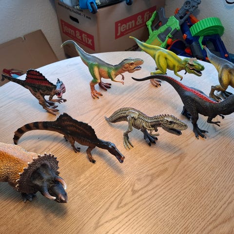 Fede dinosaurer af mærket schleich. De fleste Dinosaurer, er i rigtig fin stand, nogen af dem har mistet lidt maling på fødderne, og halen. Nogen af dem mangler også en tå eller en finger,(se billeder). Det sidste billede indeholder en masse små dinoer, og diverse som ikke er schleich. Skriv gerne for mere information, jeg er villig til at sælge det hele samlet men også villig til at sælge enkelte styks. kan afhentes i Nyborg eller sendes for købers regning.