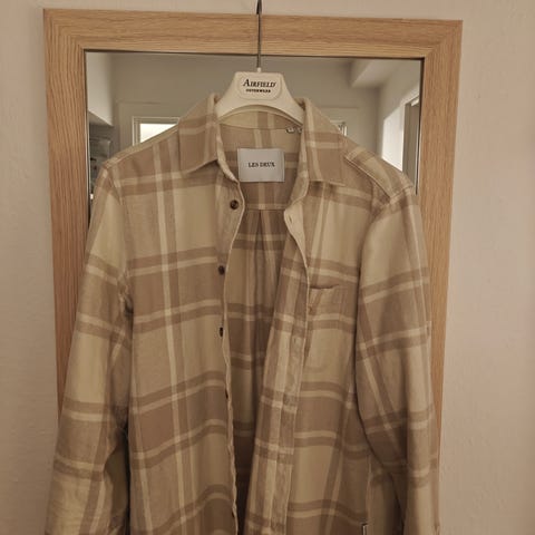 Les Deux skjortejakke i størrelse L til mænd. Jakken er sort med tern og lavet af bomuld. Designet som en skjortejakke med knapper foran og brystlommer. Org pris 1500kr Din pris 600kr