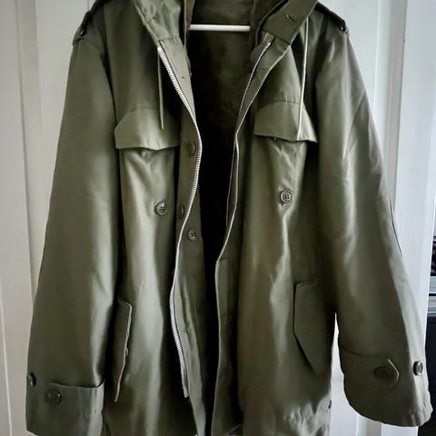 Formodentlig svensk army vinterfrakke med ægte lammeskind. Kun lidt brugt