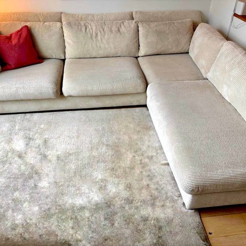 Sofaen har vendbart hjørne, så den kan tilpasses rummet, og aftageligt betræk, som netop er nyvasket. Den fremstår pæn og klar til brug.
