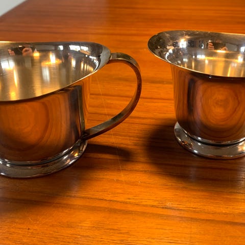 Sæt bestående af sukkerskål og flødekande i sølvplet. Med smukt indgraveret englemotiv. H: 10 cm. Sender gerne mod betaling af fragt.