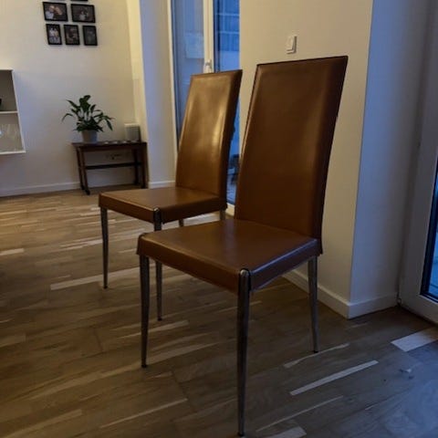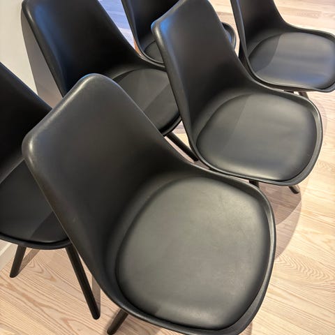 Sæt med 6 flotte spisebordsstole i mørk brun/sort imiteret læderlook med quiltet ryg og sorte metalben. Stolene har et moderne og tidløst design, der passer perfekt til de fleste spiseborde.