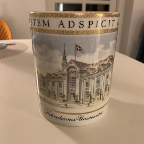 Royal Copenhagen Jubilæumskrus fra 1979 i porcelæn. Kruset har motiver af Københavns Universitet og er dekoreret med blå og guld detaljer.