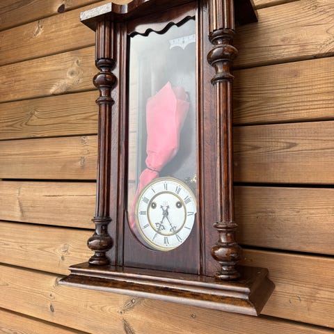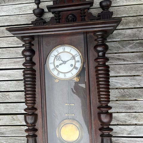 H.A.C. 14 Day Strike kakkelur med træhus og mekanisk urværk. Uret har en urskive med romertal og dekorative detaljer i metal. Designet til at køre i 14 dage mellem optræk. Fremstillet i Württemberg.