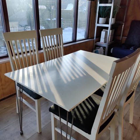 Hvidt spisebord med 4 sorte stole