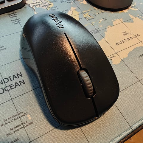 Rapoo trådløs mus i sort farve. Musen drives af batterier og har en trådløs modtager til tilslutning. Den har justerbar DPI og tænd/sluk-knap på undersiden. Designet til brug med computere.