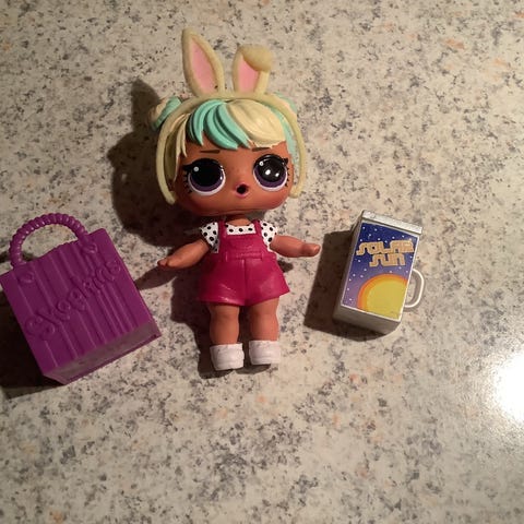 L.O.L. Surprise dukke med tilbehør bestående af en dukke med pink og lilla hår, en lille grøn figur og en mælkekarton. Dukken er designet til børn og kan bruges til leg og samling.