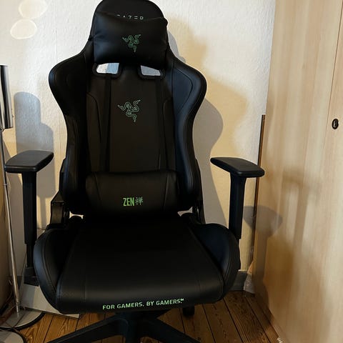 Razer Edition gaming stol i sort med polstring i PU-læder. Stolen har justerbare armlæn og inkluderer nakkepude og lændepude for ekstra støtte. Designet til brug ved skrivebord og gaming med ergonomisk form.