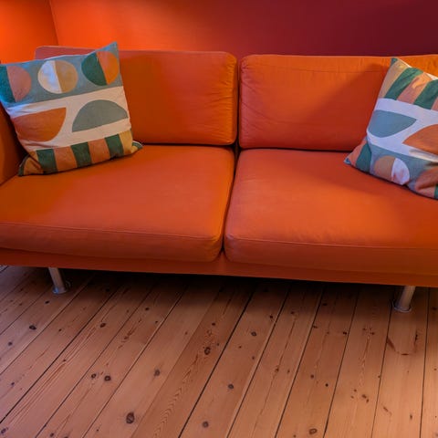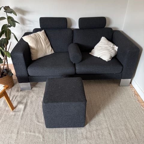 Uldbetrækket giver et naturligt, slidstærkt og temperaturregulerende materiale, som både er behageligt at sidde i og holder sig flot over tid. Sofaen er velholdt og fremstår i pæn stand med almindelige, naturlige brugsspor.