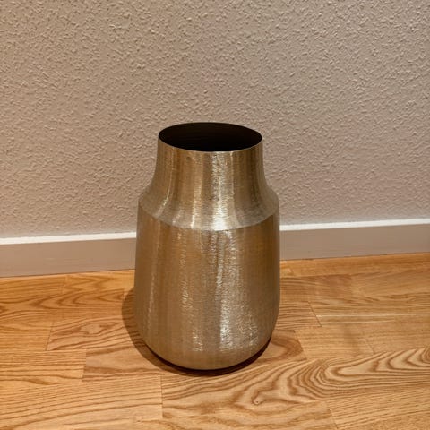 Vase i metal med en slående guldgraver overflade og en håndhamret tekstur. Vasen har en cylindrisk form med en let indsnævring mod åbningen, hvilket gør den velegnet til dekoration med tørrede eller friske blomster. Materialet og designet giver et moderne og industrielt udtryk.