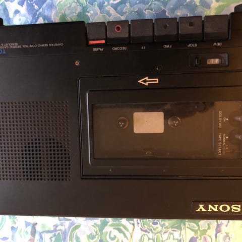 Potmeter og kontakt i toppen er en modifikation, som skulle give mere styringen til afspilningshastigheden. Det virkede ikke, men har ikke indflydelse på maskinen og kan fjernes med en loddekolbe :-)