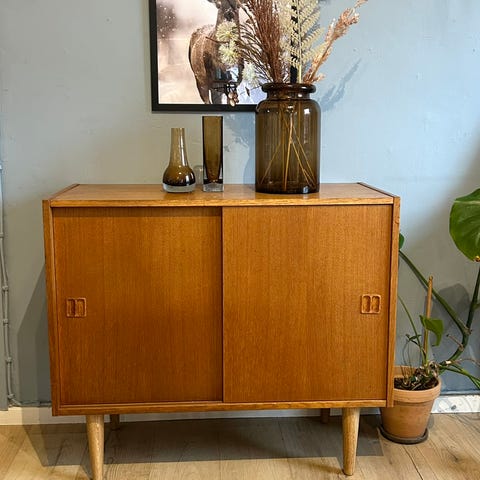 Teak træ skænk, 2 skydelåger. Ene side med 3 bestik skuffer med grøn Filt. Anden side med en hylde i midt. Barskabs indholdet følger ikke med.