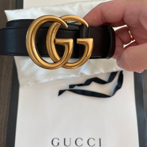 Gucci GG Marmont reversibelt bælte til kvinde. Bæltet er lavet af læder og har to farver, sort på den ene side og beige på den anden. Det har en guldfarvet spænde med GG-logo. Bæltet er designet til at kunne vendes og bruges på begge sider.