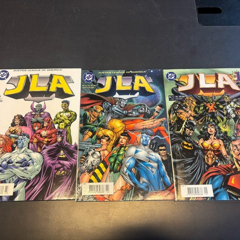 DC Comics JSA tegneserie med forskellige historier og illustrationer af Justice Society of America (JSA) superhelte. Serien indeholder flere bind med farverige omslag og forskellige karakterer fra JSA-universet.
