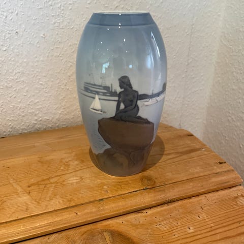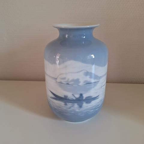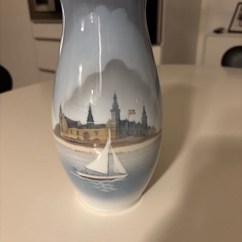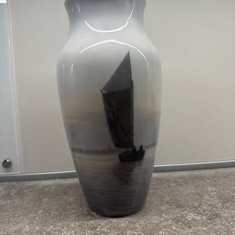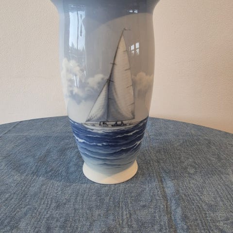 Bing & Grøndahl vase med motiv af et skib i blå og hvide nuancer. Vasen er fremstillet i porcelæn og har en cylindrisk form med let udvidet top. Velegnet til dekoration og som blomsterholder.