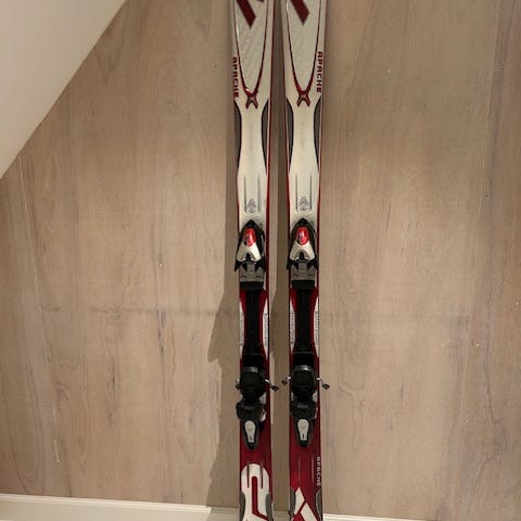 K2 Apache Race Pro ski sæt med stave og pose. Skiene er designet til alpint skiløb på flere slags sneunderlag og pistetyper. Skiene har bindingssystem af tilsvarende god kvalitet.