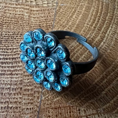 Stor flot fingerring med en mørkeblå smykkesten (ukendt). Stenen har et meget fint mønster på alle sider og den er str. 56 (indvendig diameter 17,95 mm). Ringen er forsølvet og den er helt ny. OPRYDNINGSPRIS