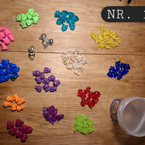 Jojo, Gogos, Dracco Heads i gennemsigtig (+ én helt klar gennemsigtig) og guld.