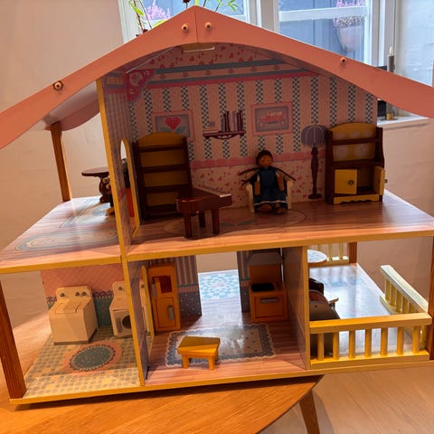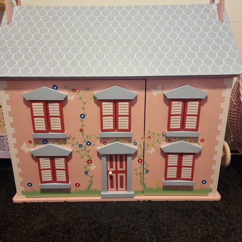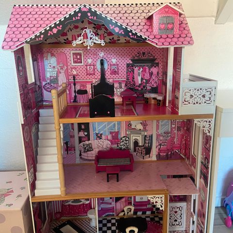 Dukkehus lavet i mdf plader det ene vindue er gået itu der medfølger møbler det måler