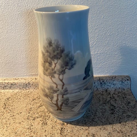 Bing & Grøndahl vase med håndmalet landskabsdekoration i blå og hvide nuancer. Vasen har en rund form med en smal hals og bredere krop. Fremstillet i porcelæn. Velegnet til dekorativ brug.