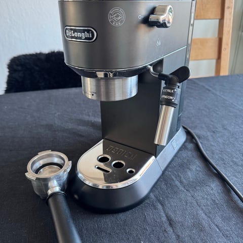 De'Longhi espressomaskine i hvid med indbygget mælkeskummer. Maskinen har en portafilter, tamper og mælkekande i rustfrit stål. Velegnet til brygning af espresso og cappuccino.
