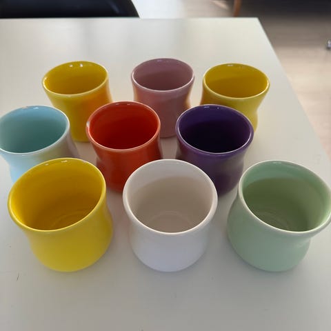 Kähler Mano-kopper, 8,5 cm høj, det lysebrune og lysegule er som nye uden tegn på brug, det lyserøde og lyseblå har begge et lille skår (se billeder), prisidé 150kr samlet eller BYD