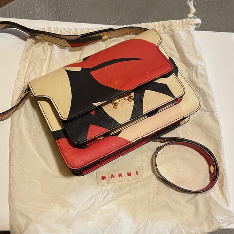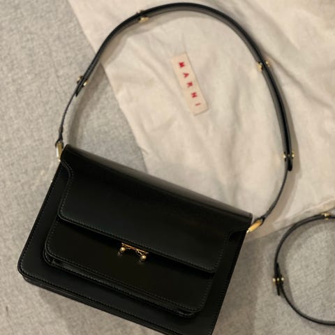 Skulder/cross i skind fra MARNI i sort/hvid/brun farve, (aftagelig rem),med plads til pc 35x30cm. lynlås 2 lommer og en lille clutch, dustbag medfølger, aldrig brugt stadig med tag. Ny pris 900€.