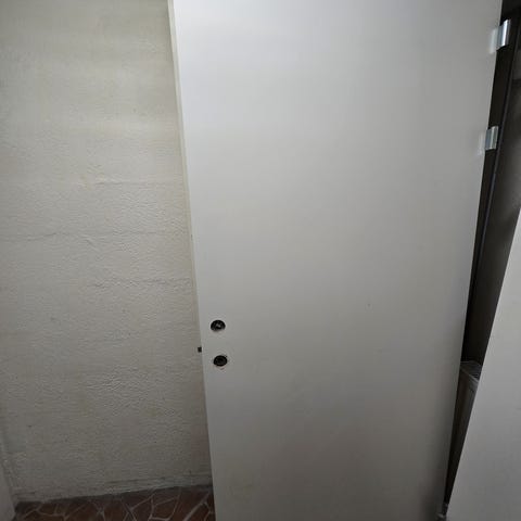 Branddør med lys grå overflade, udstyret med låsekasse og hængsler. 82,5 x 204, højre hængt