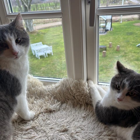 Hejsa, vi er to dejlige og nysgerrige kastrerede han-katte, som mangler et sted vi kan kalde hjem. Jeg, den hvide, hedder Snow, er en Ragdoll, og er to år gammel. Min makker hedder Bailey, han er en blanding af huskat og hemmelig race, og er et halvt år gammel.