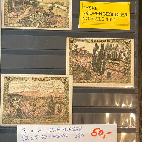 Nødpengesedler fra Tyskland. Samling af 11 helt gamle nødpengesedler fra årene 1916 til 1918, altså fra 1. Verdenskrig. Det er de såkaldte Verkehrsscheine, altså sedler der virkeligt har været udgivet med det formål at blive brugt. Der er 11 forskellige. Kvaliteten er meget fin, næsten ingen af sedlerne har været brugt, der er flere sjældne imellem. Hver seddel sidder i sin egen plastlomme og er forsynet med katalogreferencer samt katalogpriser. Der er i alt en katalogpris på € 42,-, det svarer til ca 315 kroner. Prisen for alle sedlerne er 90,- kroner.