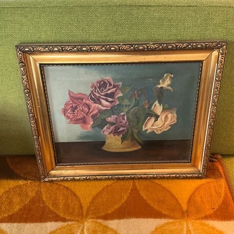 Ældre maleri med varme farver forestiller blomst i urtepotte med tydelige penselstrøg. Kunstnernavnet er svært at læse. Måler 70 x 82 cm