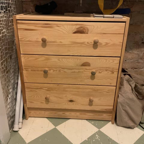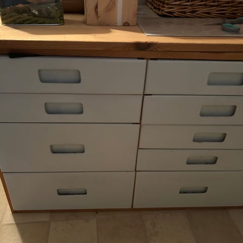 God, praktisk indbygningskommode til Ivar stigereol - den dybe version. Meget rumlig. 3 store skuffer og 6 lavere. Lysnet med hvid pigment olie.