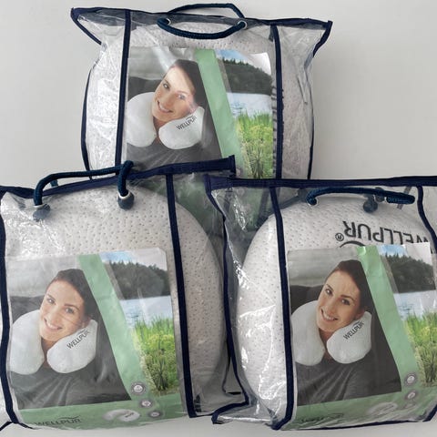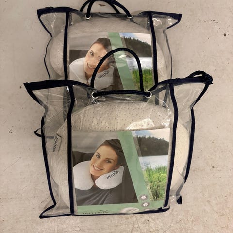 Nakkepuder i blå og grøn farve. Puderne er designet til at give støtte til nakken under rejser eller hvile. Materialet er blødt og behageligt mod huden.