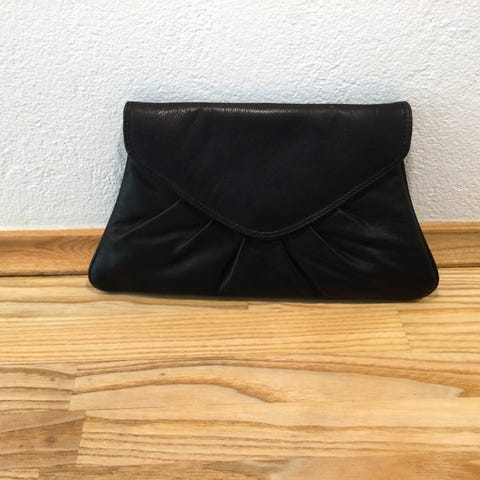 Clutch taske i sort læder til kvinder. Tasken har en lukning med spænde og en lynlåslomme indvendigt. Den er designet til at blive båret i hånden eller som en aften- eller festtaske.