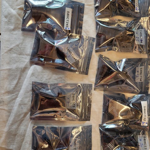 Kasse med diverse kredsløb og forskellige andre ting , der er en masse forskellige kredsløb og div andet se billeder, har taget billeder af et par stykker og ladet ai skrive teksten