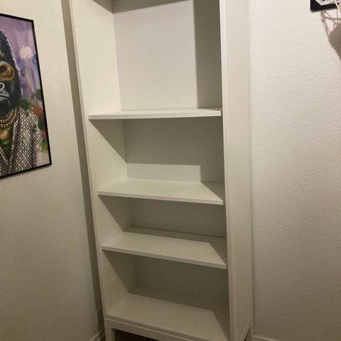 Den øverste enhed med de to låger ligger ovenpå den egentlige reol. Reolen har højden 190 cm og enheden med låger højde 35 cm.