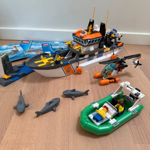 LEGO City kystvagt 60014. Sættet indeholder et stort redningsfartøj, en helikopter, en lille båd, og diverse tilbehør.
