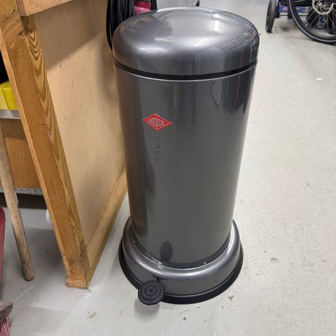 Sort skraldespand fra WESCO med inderspand. Der er lidt buler i låget, men fungerer ellers fint.