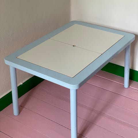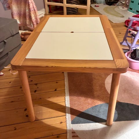 IKEA børnebord med to opbevaringsbakker i grøn og orange. Bordet har en træramme og to hvide bordplader, der kan åbnes for adgang til opbevaringsbakkerne. Velegnet til børns aktiviteter og opbevaring af småting.