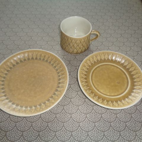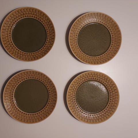 5 stk tallerkner måler 24,5 i diameter, der er ingen skår men brugsspor I det grønne i midten, se billederne. Se også mine andre opslag med forskelligt fra denne serie. Prisen er pr stk.