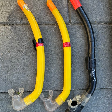 Dykkerbriller med snorkel i blå farve. Brillerne har to glas med hærdet glas og en gennemsigtig silikonekant. Snorklen er sort med en hvid mundstykke. Brillerne er justerbare og egnet til brug ved dykning og snorkling.