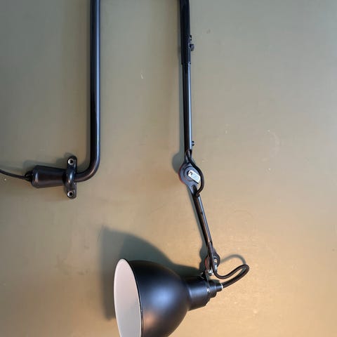 Lampe Gras N°304 L60 væglampe fra DCWéditions med et industrielt design i stål med en vinklet arm og en vinklet lampeskærm