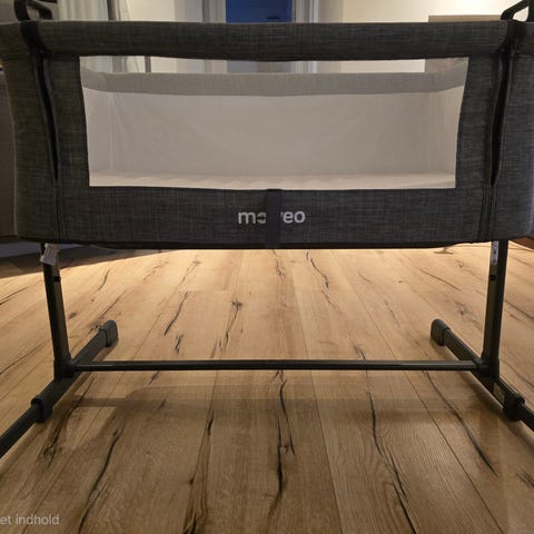 Moweo Bedside crib til børn. Sengen er designet til at placeres ved siden af forældresengen og har netvinduer for ventilation og overblik. Den er fremstillet med et metalstel og stofmateriale i grå farve.